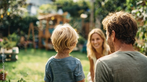 Back view of happy gay parents conversing as their son plays outside