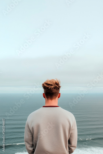 Back view of man gazing at the ocean during pastel sunset, calm and peaceful moment at the beach