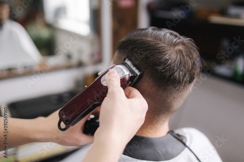 Back view of Men in beauty salon. Men's haircut in a barbershop. New haircut style 2021. Professional hairdresser uses a hair clipper for fringing hair