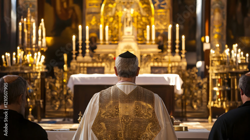 Back View of Religious Figure at Ornate Altar Glowing with Candlelight : Generative AI