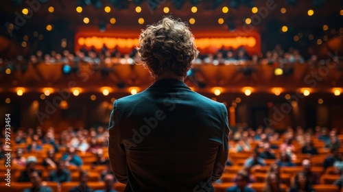 back view of speaker facing audience, debate vibrancy, intense focus on public speaking, AI Generative