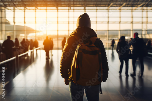 Back View of Traveler with Backpack Walking in Airport Terminal at Sunset