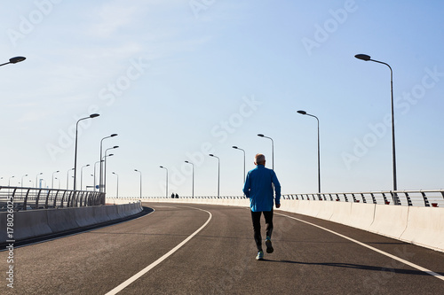 Back view of unrecognizable senior runner having intensive workout outdoors, cloudless blue sky on background