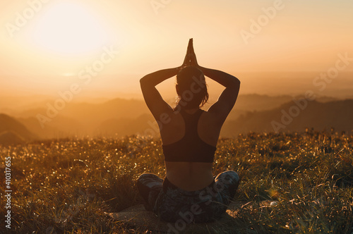 Back view of woman that practices yoga in nature. Lotus pose with her hands over her head