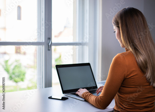 Back view of young freelancer working on laptop by the window with beautiful view.