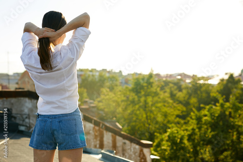 Back view of young woman putting her dark long hair together while looking at cityscape on sunny day