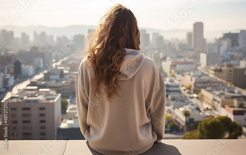 Back view shot a young brunette girl in a light jacket sits on the roof of a high-rise building overlooking the city.