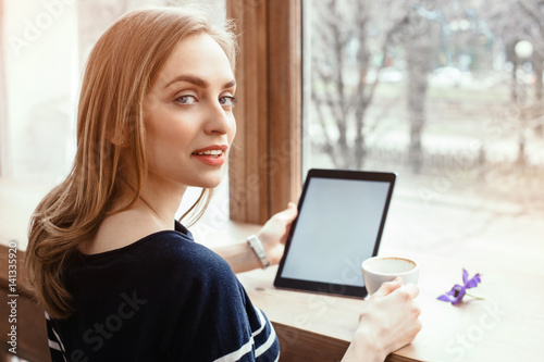 Back view smiling beautiful young woman read magazine with digital tablet near big window in a cafe or home. Attractive woman while studying and relaxing. Looking at camera. white space area tablet