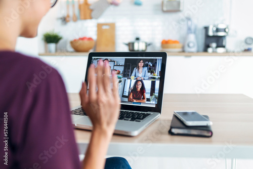 Back view young woman having video call with the laptop web camera in the kitchen at home.