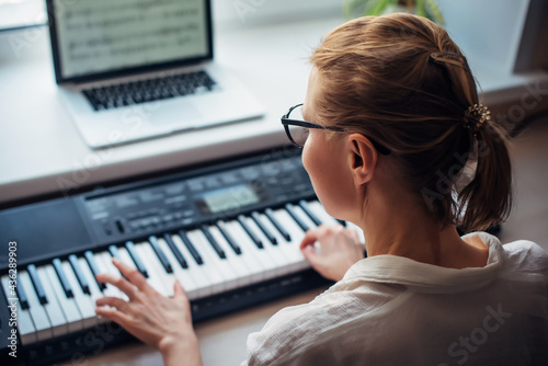 Back view young woman playing a synthesizer, reading notes on a laptop screen, close up. Independent learning to play the piano at home. Passion for music, hobbies, leisure, self-development.