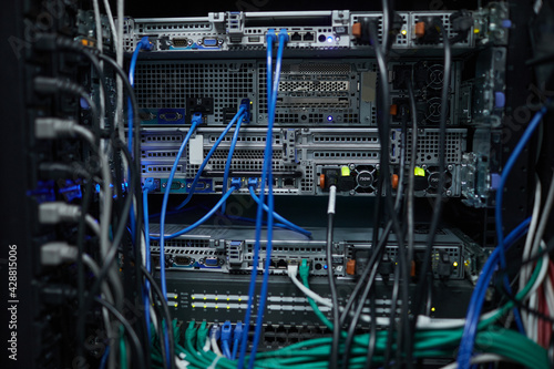 Background close up of server cabinet with cables and wires in data center, supercomputer concept, copy space