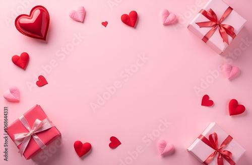 Background design for Valentine's Day. Valentine's Day greetings with hearts and gifts for a romantic holiday greeting. Selective focus, shallow depth of field, blurred background