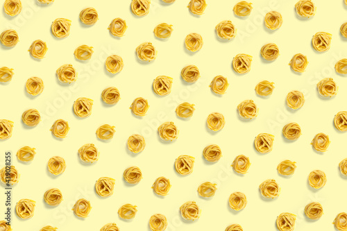 background from Italian tagliatelle pasta. raw pasta fettuccine, pop art background, flat lay. Italian raw nest pasta isolated on yellow. not seamless pattern