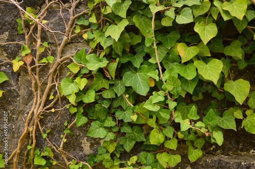 Background from old brickwork, vine leaves are woven in the upper right corner