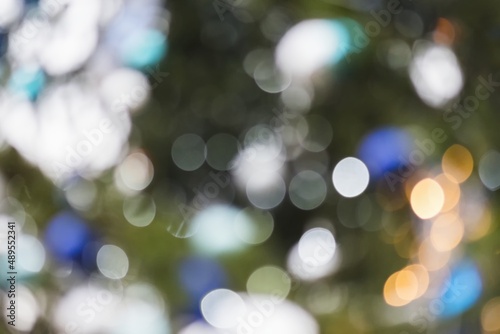Background. In bokeh, evening city, Christmas trees, lamps, lights and ornaments. Tree alley in background. Christmas atmosphere for markets, city centers. People.