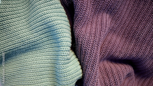 Background is filled with knitted fabric of different colors. Turquoise and purple. Clothing. Background is divided into two unequal parts by purple and turquoise knitted fabric. Hand made. Fashion.