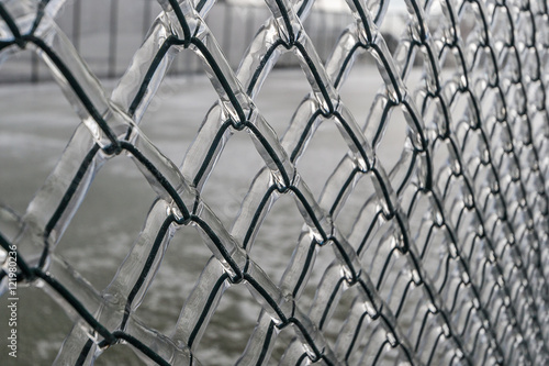 Background. Metal grid in ice. In winter, the rain and froze on the fence mesh