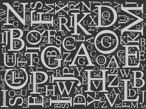 Background mosaic of light latin alphabet letters in various sizes on dark background. Serif font. Vector illustration background. School theme. Education theme. Library theme.