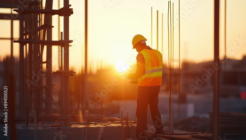 Background of a worker inspecting a project at a construction site Building Site at Sunset