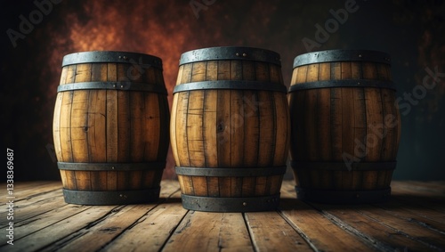 background of barrel3 wooden barrels arranged prominently in a dimly lit setting.