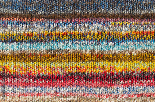 background of bright multi color striped fabric knitted by the hand
