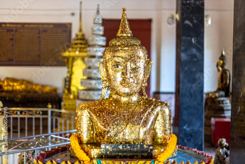 Background of Buddha statue, Wat Phra Thong, Wat Phra Phut, Phuket, Unseen, ancient temple, sacred, there are always Thai and foreign tourists visiting to make merit.