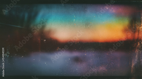 Background of Christmas red retro film overly, image with scratch, dust and light leaks. Xmas lens flare holographic effect background.Glowing glotter bokeh winter holidys aesthetic