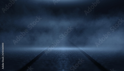 Background of empty dark room with rays of light. Concrete floor with light reflection. Smoke, neon blue light