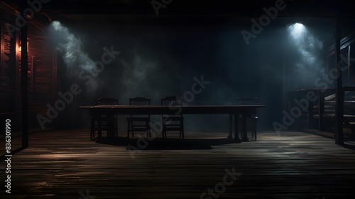 Background of empty dark scene with wooden old floor. Neon light smoke. Dark abstract background. Night wooden table.