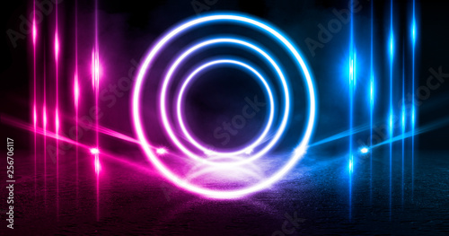 Background of empty stage, room. Reflection on wet pavement, concrete. Neon blurry lights. Neon circle figure in the center, smoke