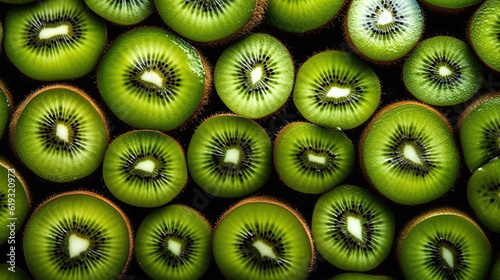 Background of fresh kiwi arranged together representing concept of health diet. Top view. Generative Ai