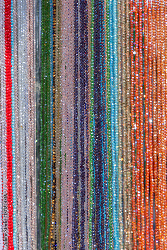 Background of multicolored bead strands arranged in vertical rows shimmering surfaces reflect light