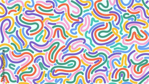 Background of multicolored hand-drawn wavy lines on mint green background, abstract pattern, playful design