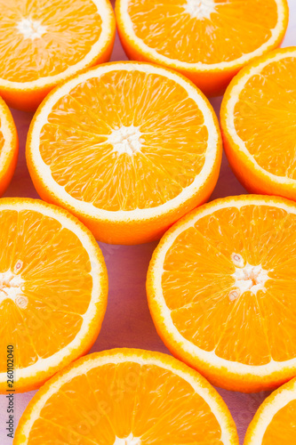Background of oranges fruits. Many halves of fresh oranges, top view. Citrus for making juice. A lot of sliced oranges on a white background. Concept
