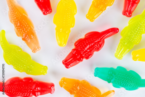 Background of Swedish candy, chewy candies in the shape of crocodiles on a white. Top view.