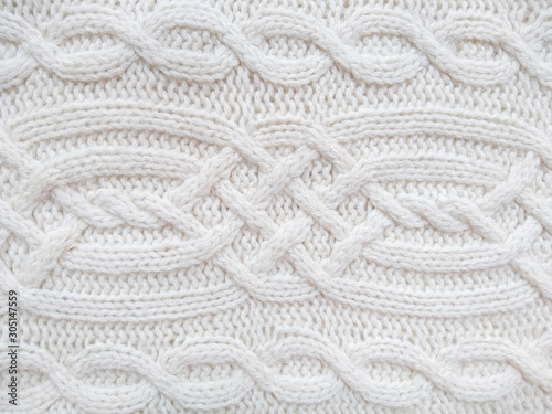 Background of wool yarn for yarn frame. White knitting yarn for handicrafts background. Knitted clothes from wool yarn.