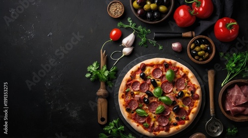 background, pizza, baked, menu, nutrition, object, olives, organic, parsley, pastry, pepper, recipe, meal, restaurant, sausages, smoked, snack, table, tasty, top, traditional, view, meat, mediterranea