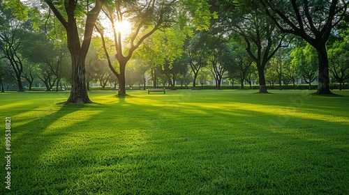 Background texture of fresh green lawn of a local public park with beautiful trees in the soft morning sunlight.
