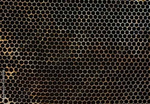 Background, textured black and white honeycombs. Bee honey frame, honeycomb wax. Beekeeping.