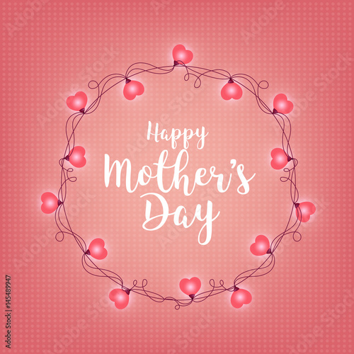 Background with badge and greeting Happy Mother s Day. Abstract retro light frame. Realistic color garlands, festive decorations. Glowing lights. Vector illustration.