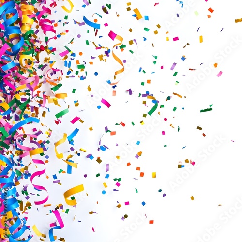 Background with colored confetti and streamers isolated on white background for birthday party or New Year's festivities