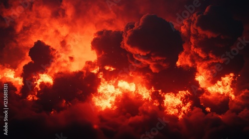 Background with dark smoke clouds in red light after explosion or natural disaster. Abstract banner for military operations, disasters, war games, ads with copy space. Battlefield under attack.