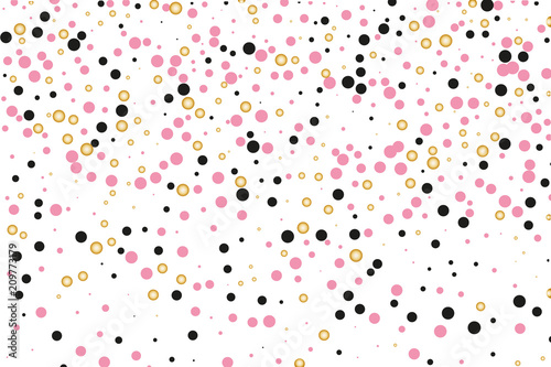 Background with Golden, black and pink glitter, confetti. Random Polka dots, circles, round. Bright festive, festival pattern