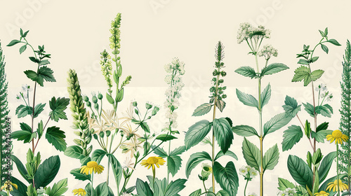 Background with grass and flowers with floral pattern, leaves, and nature elements, seamless illustration of plants, decorated with branches, blossoms, and vintage textures, 16:9