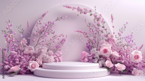 Background with podium and flower rose. Floral summer background podium. Generated by artificial intelligence.