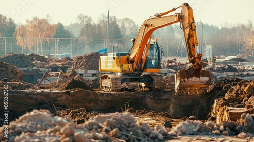 Backhoe in action, digging deep into the soil at a construction site, showcasing powerful machinery