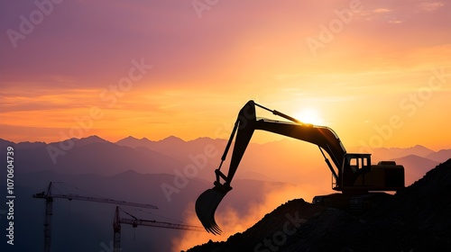 Backhoe Silhouette Against Vibrant Sunset - Construction Site with Cranes and Steel Beams Creating a Stunning Urban Landscape