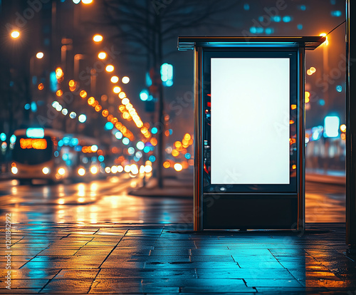 Backlit poster display on wet city street at night with blurred traffic lights, perfect for showcasing advertisements or promotional designs