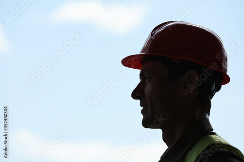 Backlit side view portrait of male construction worker wearing hardhat while standing against sky in background, copy space
