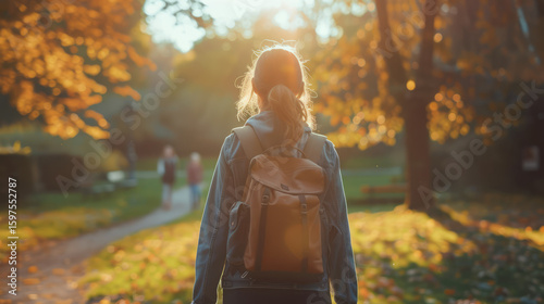 Backpacker explores a sun-drenched autumn park, enjoying the beauty of nature with a leather rucksack.